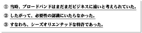 上の事例でのもっとも本質的なことはブロードバンドのニーズが特許を考えた時期から約20年近くたってか